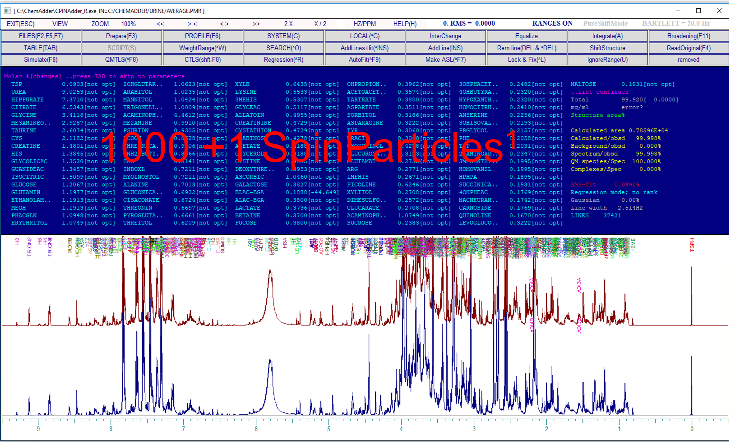 The 1000+1 model system simulates the typical human urine metabolome (Bouatra S. et al, The human urine metabolome. PLoS ONE 8, e73076, 2013) added by some sugars and testosterone (= the largest spin-system, with 23 particles). The spectral parameters are mainly from our own spectral analyses, from the spectral parameter prediction (Laatikainen R. et al, Comprehensive Strategy for Proton Chemical Shift Prediction: Linear Prediction with Non-Linear Corrections, J.Chem.Inf.Model., 2014, 54, 419) and from analyses of HMDB spectra. Because the variable origin of the parameters, the present model cannot be used for demanding analyses – our purpose was just to demonstrate the potential of qQMSA and report the largest N-spin QM simulation ever done.